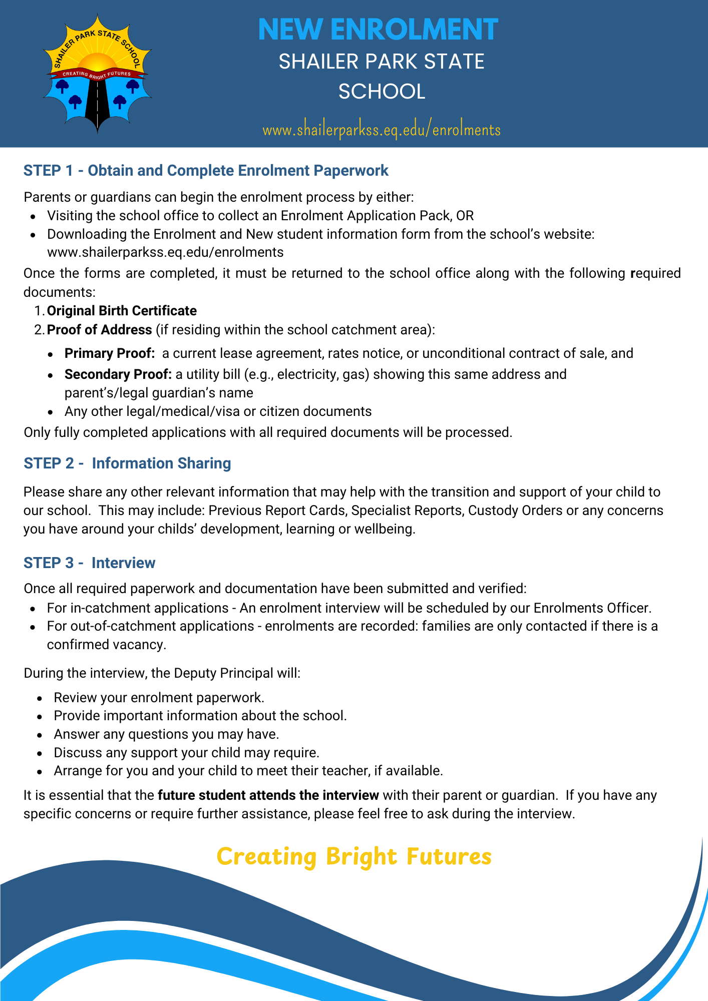 - Completing the New Student Information form and emailing to enrolments@shailerparkss.eq.edu.au